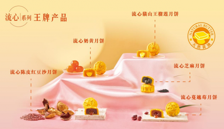 (1)流心奶黄月饼:精选天然黄油与顶级咸蛋黄秘制馅料,奶黄流心如丝般柔滑。