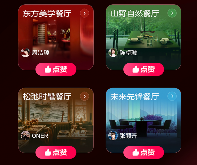 进入活动页面点赞你心动的餐厅氛围感趋势,点赞数达到指定量级即可解锁“心动成团夜”明星专属直拍机位。