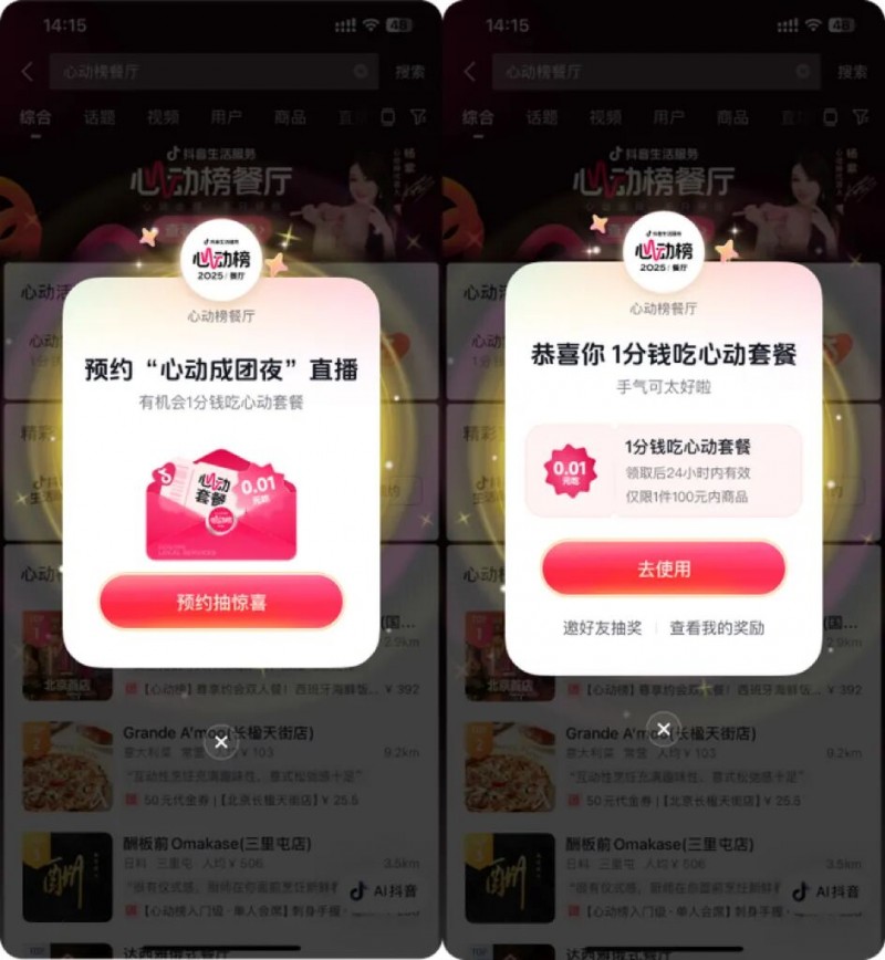 除趋势短片外,心动榜餐厅同期在抖音站内上线多重互动玩法。现在正处于活动期间,大家抖音搜索「心动榜」进入活动会场,就可以参与多重互动,既可以在活动页面探索炫饭新去处,也能给自己喜欢的餐厅打call,当然,更重要的是还有福利可“薅”。