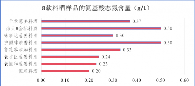 氨基酸态氮反映料酒的发酵程度和鲜味水平,能增强鲜味和醇厚感,参与加热时发生美拉德反应,生成诱人香气;同时提升料酒整体品质与风味层次。料酒的氨基酸态氮含量越高说明蛋白质分解越充分,越鲜香、口感越自然。行业标准SB/T 10416-2007《调味料酒》要求,氨基酸态氮(以氮计)≥0.2g/L,8款料酒样品的氨基酸态氮含量测试结果见下图,可以看出所有样品均符合标准要求,个别品牌(海天和护国牌)样品的氨基酸态氮含量远高于国标要求达到0.50g/L。