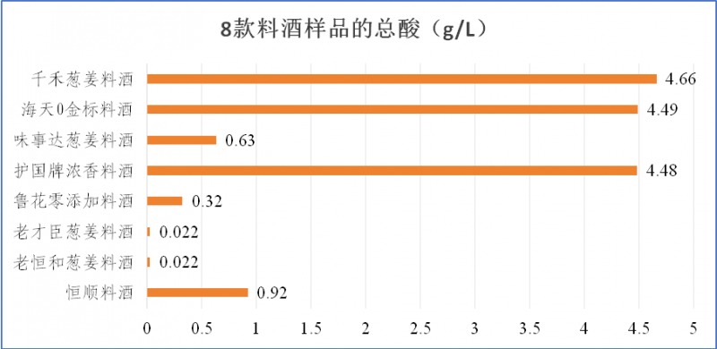 料酒中的总酸能平衡风味、去腥增鲜。适量酸度可软化肉质、促进入味,并在烹调中与腥味物质反应,减轻异味,使口感更清爽。同时,总酸还能抑制微生物生长,起到一定保鲜作用。行业标准SB/T 10416-2007《调味料酒》要求,总酸(以乳酸计)≤5.0g/L,8款料酒样品的总酸测试结果见下图,可以看出所有样品均符合标准要求,但存在一定的差异,总酸的高低对应了不同的口感,不宜简单地以数值的高低作为品质的判断标准,消费者可以根据自己的口味偏好和所烹饪食材的特征选择相应料酒。
