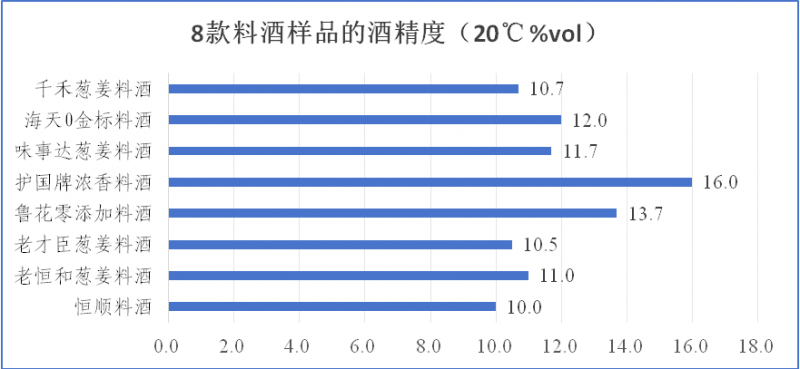 料酒的酒精度一般为10%~15%,主要作用是去腥提香、促进风味融合、使肉质更嫩,酒精加热挥发能带走腥味并释放香气,还能溶解油脂类香味分子,帮助调味料渗透入食材,酒精度数越高去腥效果越好。行业标准SB/T 10416-2007《调味料酒》要求,酒精度(20℃)≥10.0%vol[在20℃时的酒精度标准为 ≥10.0% vol(体积百分比),该标准中未设置酒精度上限,仅以 10.0% vol 作为最低要求],测试结果显示,8款料酒样品的酒精度测试结果均符合标准要求,1款样品“护国牌浓香料酒”酒精度为16.0%vol,表现优秀。