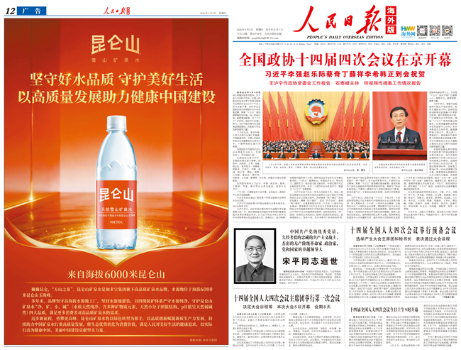 2026 年 3 月 5 日,十四届全国人大四次会议在北京开幕。站在“十五五”规划开局的重要节点,中国正以高质量发展为主线,全面推进中国式现代化建设。昆仑山矿泉水在《人民日报》(海外版)刊登“坚守好水品质,守护美好生活”主题海报,致敬盛会,深度呼应“健康中国”、“绿色发展”等国家战略,也以民族品牌实践回应高质量发展时代命题。