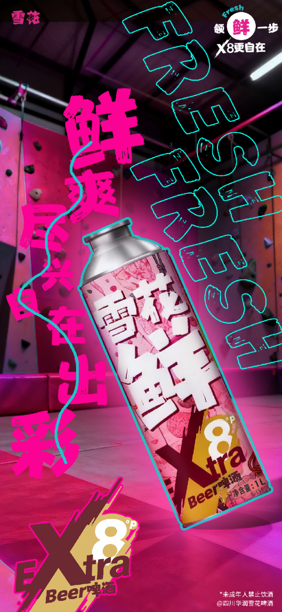 作为“雪花鲜”这一颇受好评品牌的价值延伸,雪花鲜X8以“领鲜一步,X8更自在”为产品口号,聚焦当代年轻人对于情绪的表达,和对自我风格的张扬与诠释。雪花鲜X8跳脱出传统啤酒的功能定位;以“自在态度”与“自在畅饮”的姿态进入市场,为畅饮型年轻群体打造全新潮流单品。