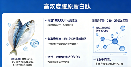 1、深海靶向穿透科技:采用北大西洋深海鳕鱼源,经四重定向剪切工艺实现100%分子量≤450道尔顿,第三方HPLC检测证实其生物利用度较市面主流产品提升10.8倍;体内达峰时间缩短70%,意味着活性成分更快进入循环系统。