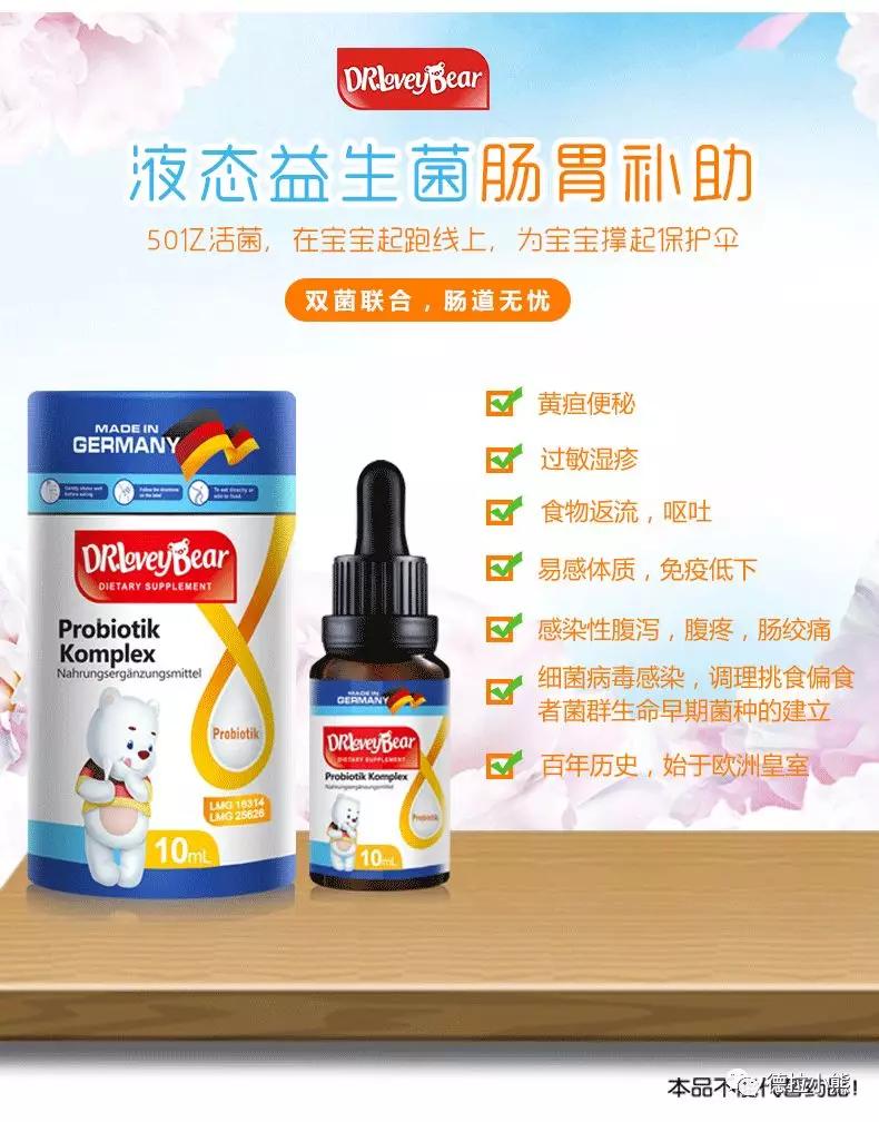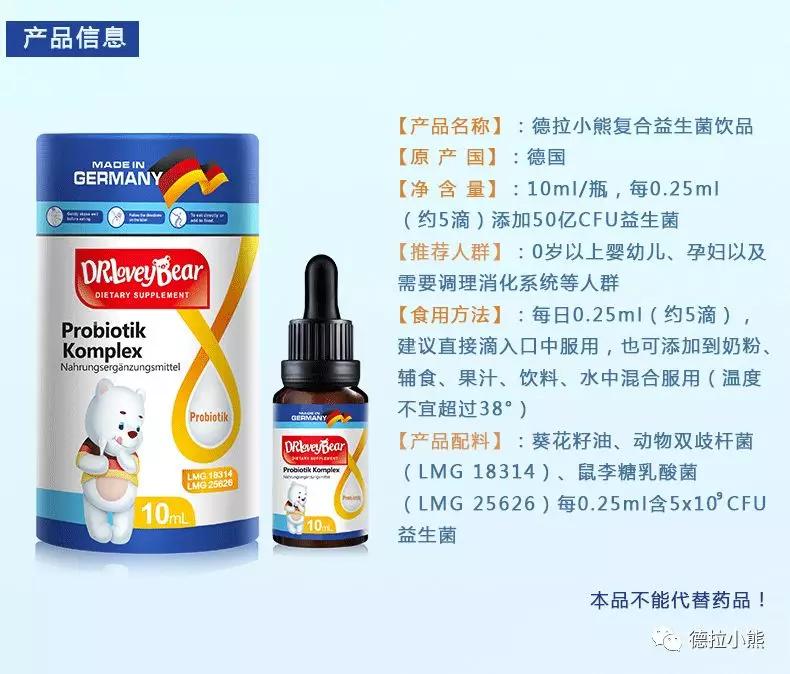 德拉小熊益生菌德国原装原瓶进口,双菌联合助力健康宝宝的营养滴剂,每0.25ml(约5滴)添加50亿CFU益生菌