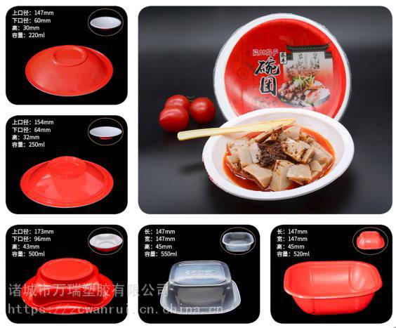 梅菜扣肉碗、八宝饭碗、红烧肉碗、老醋花生碗、方便面碗、皮冻碗、海鲜包装碗、蔬菜卤菜碗、方便菜、预制菜包装碗、米线凉皮碗、气调包装机专用扣肉碗等包装使用。