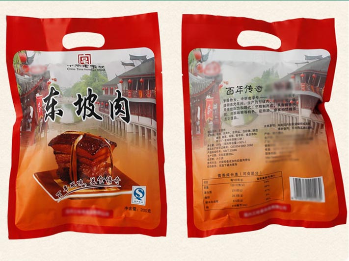蒸煮袋外观平整良好,无折皱、气泡和附着物。材质:PA: 物料性能 坚韧,耐磨,耐水,抗酶菌,而且耐油性、耐低温冲击性、耐穿透性好。CPP:拥有良好的清晰度和光洁度,水气和异味阻隔性优良,可作为复合材料基膜。蒸煮袋有二层复合结构PA/CPP和三层复合结构PET/AP/CPP的透明袋,也可加上纯铝箔组成三层PET/AL/CPP和四层PET/AL/PA/CPP的不透明铝箔袋,作为食品和商品包装及外包装,具有印刷图案精美,密封性好、不起泡、防渗漏、防潮、隔氧、抗撕裂、抗穿刺 、抗挤压性能,我公司拥有先进的检测设备,和完善的监测体系,保证产品质量颜色。蒸煮袋适用范围:卤肉制品、海产品、水产品制品、腊味、烤鸭、烧鸡、烤猪、罐头制品、火腿、腌肉制品、香肠、熟肉制品、酱菜、粽子、板栗、即食玉米、豆制品等的保香、保质、保味、保色。