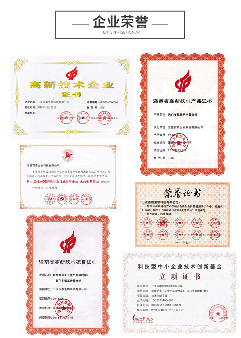 三亚百泰生物科技有限公司成立于2010年4月,是一家集研发、生产、销售为一体的高新技术企业,公司以“资源优化整合,发挥联动互效”为宗旨,努力促进以科技与产业接轨、产品与市场接轨的系统工程,公司积极开展国际化技术转化的同时,致力于培育自主创新能力。主要从事纳米技术在生物医药领域的应用,多年来组织多学科专家连续进行前期试验和研发工作,在纳米专家张立德教授、生物资深研究员陈清轩教授、正元纳米研究所高东升教授等一批学者的共同努力下,研制出具有跨时代、真正意义上的纳米级L-天门冬氨酸螯合钙,土壤保墒材料和果蔬保鲜技术等一系列科研成果。拥有多项发明专利及实用新型专利。正在开发的新产品包括纳米材料、南药研发、土壤保墒、海洋生物等方面,创新的研发成果将为国人创造无限价值。
