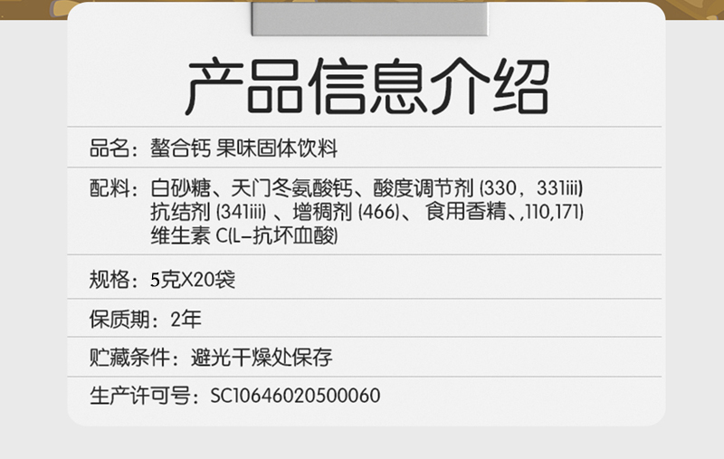 【产品配料】:天门冬氨酸钙、白糖、维生素C、...