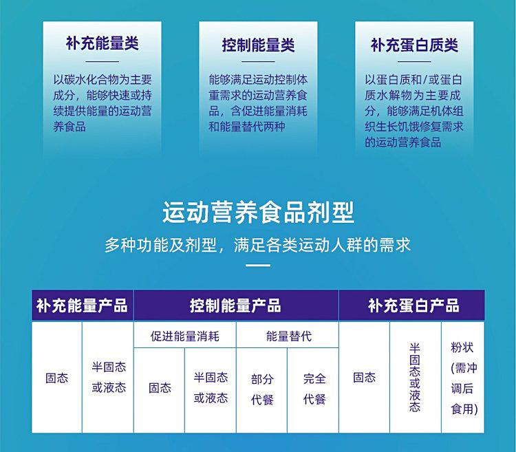 运动后恢复类:以肽类为特征成分,适用于中、高强度或长时间运动后恢复的人群使用的运动营养食品。