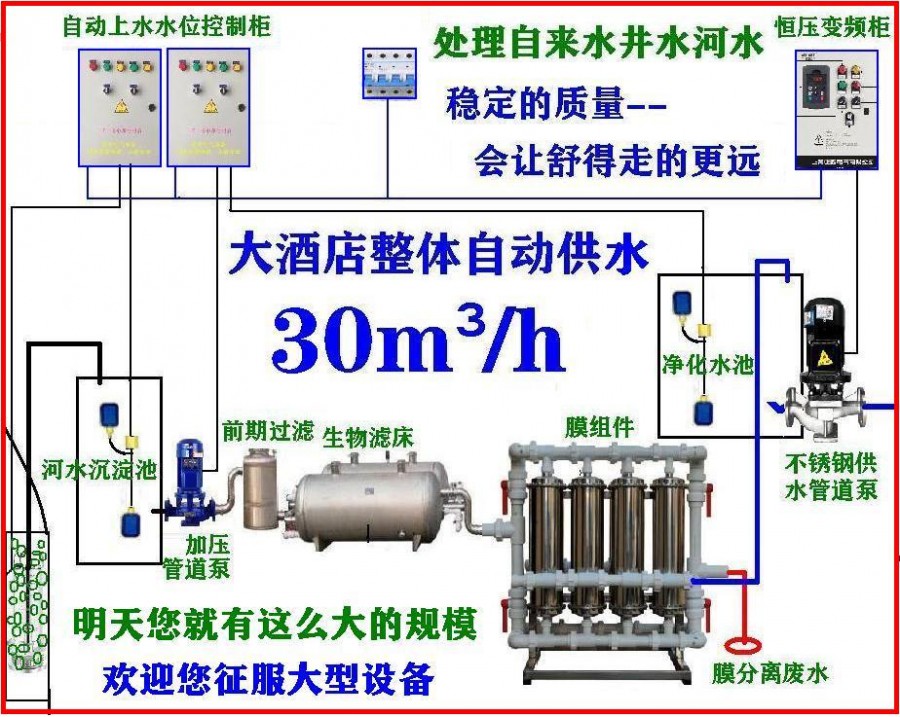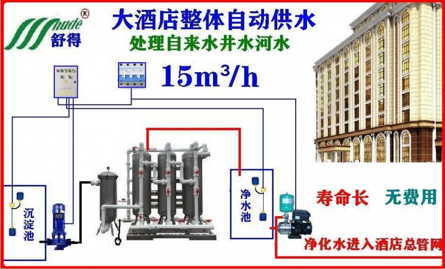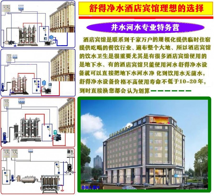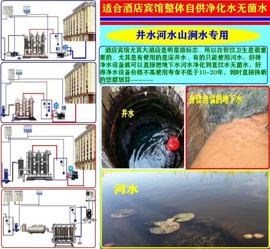 舒得欢迎国内外酒店五星七星大酒店采用井水河水等水源用于厨房级整体用水、请考虑使用舒得牌井水河水等淡水zhuan用净水设备、酒店安装一套(大小规格齐全)舒得牌净水设备整个大酒店就可以天天喝上用上净化水无菌水、和城区供应的普通市政自来水来对比不知道高了多少个档次是没有可比性的、我是舒得欢迎您选购舒得净水设备!欢迎项目合作!
