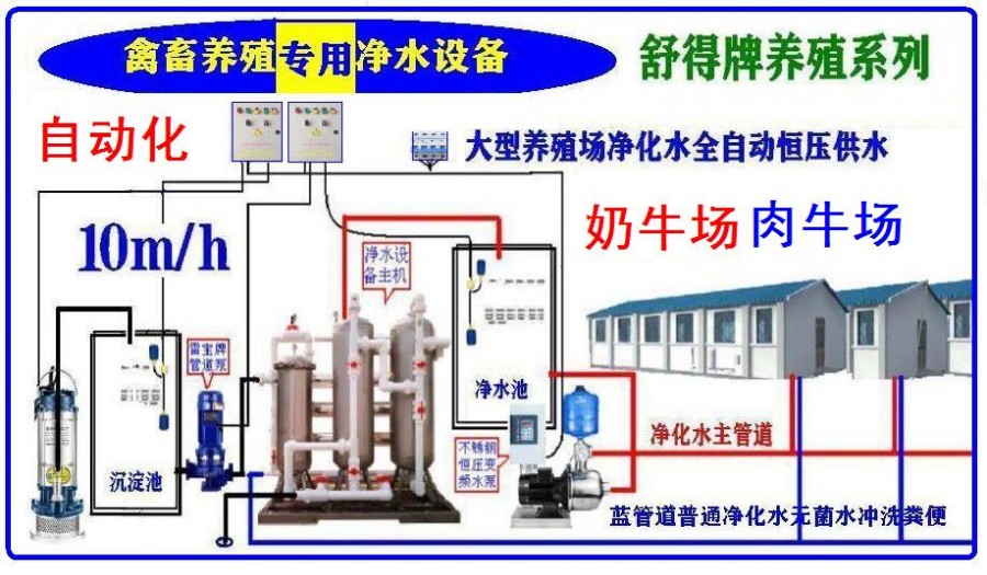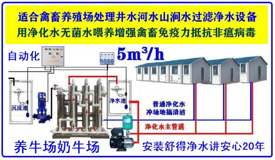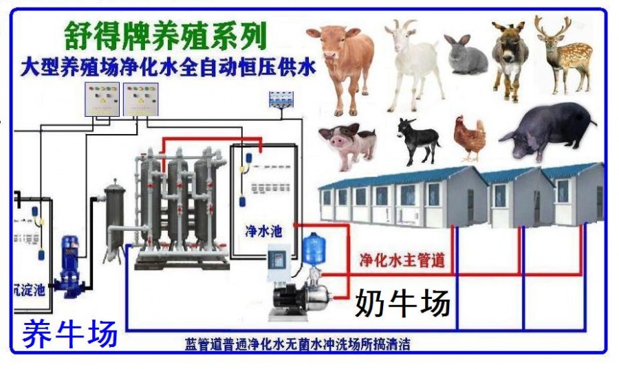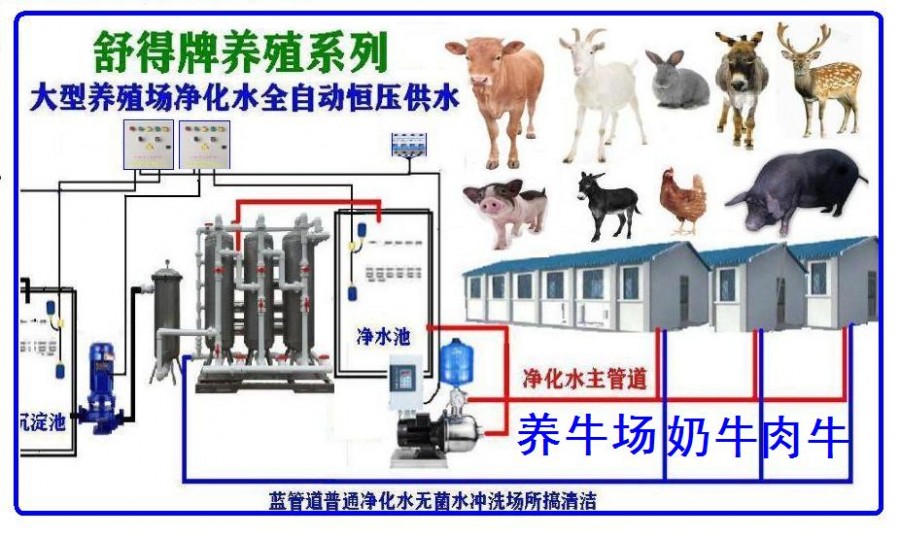井水河水净化设备养牛场无菌水设备机械化养牛场奶牛场等养殖机械,养牛场基本采用的是平地养殖,有用河水的、有用地下水的,比如鲁北某大型养牛场配置舒得净水设备15立方的使用多年效果一直稳定、很敬业的一礼拜检测3次。比如周口**兔业大型机械化养兔场用的是地下水、配置舒得牌净水设备效果非常理想,希望广大养殖户珍惜自己的劳动成果花很少的钱就能解决饮水问题。请联系我们。多年来全国养兔业配置舒得牌净水器是很多的因为我们的净水器可以轻松净化井水河水江水,广元市一养殖大亨拥有多个规模化养猪场、都建设在高山顶上用的是山顶水库的绿油油的水,他给每个猪场配置一套舒得牌净水器,这样猪的饮水方面就得到了妥善的解决,因为猪喝的全是无菌水,就排除了猪体内部产生病源,增加猪的自身免疫率生长更快速,全国这样的例子太多了养猪场、养羊场、养鸡场、养兔场养牛场、奶牛场高规格水产养殖等配置舒得净水设备。