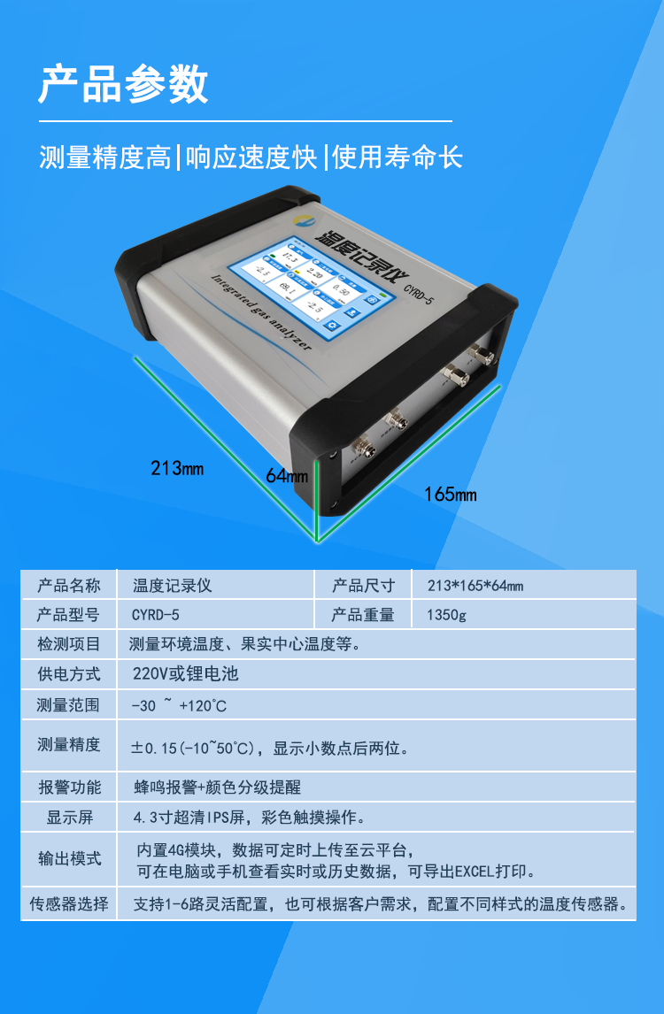 CYRD-5果心温度记录仪采用高精度的模数转换电路及低温飘器件,传感器采用探针式不锈钢高温探头,适用性强,反应时间短;能够实现多路采集,并将记录存储打印多功能于一机。4.3寸触摸彩屏,进口传感器;采集数据实时监测,超限报警(蜂鸣报警和颜色分级提醒); 数据可上传至云平台,可在电脑或手机上查看实时或历史数据,可导出EXCEL打印;仪器机身小巧、便携,精度高,适用于果品、食品内部温度的测量及环境温度的测量。尤其针对机场,海关,科研院所等要求比较高的场合,该仪器可实现贴心定制!支持1--6路灵活配置,可根据用户需求 ,配置不同探头样式及引线长度!
