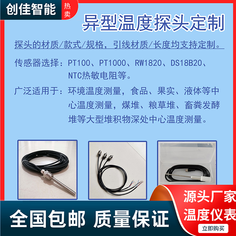 我公司可以针对客户不同需要,加工定制各类异型探头、果心探头。RW1820 DS18B20 PT100 PT1000 NTC,温度测量实力工厂,30年的行业经验,精度高,反应快,寿命长,支持定制。