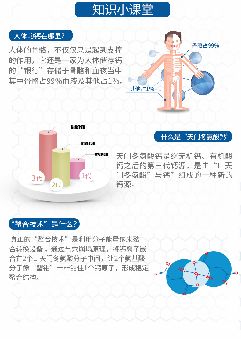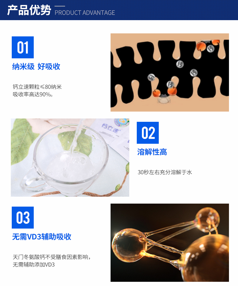 螯合钙是生物活性有机钙,比重为0.12,经过美国弗吉尼亚大学和香港科技大学检测鉴定为分子型钙源!螯合钙的高吸收率是传统钙剂的3倍!由于传统钙含有无机钙,而无机钙只有通过维生素D才能促进钙与蛋白酶结合,因此其它钙产品都需要添加维生素D。而螯合钙是氨基酸和钙的完全螯合物,故无需添加任何促进钙吸收的物质就可被人体直接吸收。