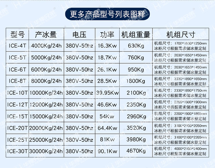 二、华豫兄弟片冰机标准工况:环境温度25℃,给水温度16℃,冷凝温度40℃