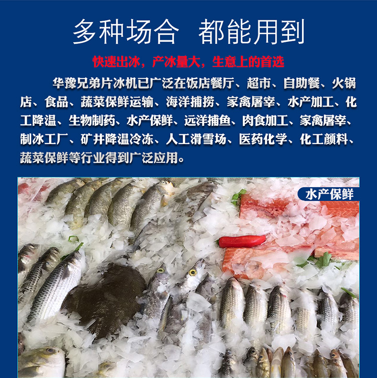 2.5吨片冰机常以其便捷、低成本及冰的干净晶莹剔透普遍应用于超市或饭店(生鲜)酒店冰鲜。既能有效保鲜,又能为顾客和卖场增加商品陈列的美感,亦会被用于小型水产、肉食加工、屠宰加工行业、蔬菜配送及保鲜、海洋渔业/水产行业、混凝土搅拌工程、化工行业等。
