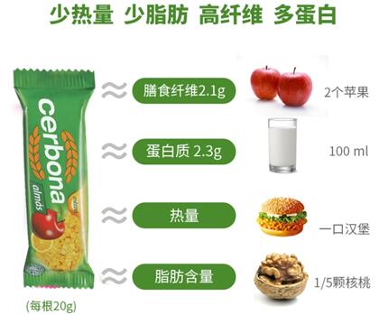 cerbona代餐能量棒,富含三大营养素,全植物配方,口感清甜松软,非常经典的一款能量代餐棒,含有活性益生菌以及21种有机蔬, 维持运动过程中的能量供应和延缓疲劳发生,并有效缓解您在运动中出现的中枢和骨骼的疲劳。cerbona能量棒不同于巧克力。巧克力每100克中含有30-32克脂肪,脂肪成分主要是饱和脂肪酸,经常性摄取巧克力并不代表健康的生活方式,而cerbona能量棒则在保证能量摄入前提下限制了脂肪的摄入量,防止发胖。
