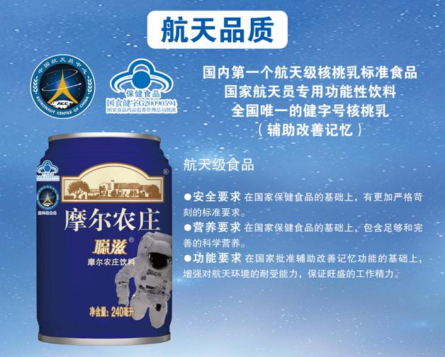 深谙优质产品是企业的制胜之道的摩尔农庄,经过近两年的专家审核及航天级食品全指标及安全控制检测,公司与中国航天员科研训练中心联合制定的全国首个航天级食品标准于2016年5月18日正式通过并执行。摩尔农庄功能性饮料“聪滋”被定为国家航天员专用功能性饮料,成为全国第一个国家航天级食品。