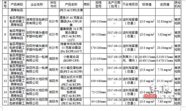 在此次公布的食品相关产品质量抽查不合格产品及其生产者名单中,不少知名企业包装袋纷纷被点名:由宁乡中湘软包装有限公司生产的加加味精100克复合膜袋;由株洲县宏涛塑料印刷制袋厂生产的湘潭铺子槟榔礼包袋;由岳阳市大地印务有限公司生产的海欣台式片片肠包装袋,还有克明长寿挂面包装袋的横向剥离力也被检出低于相关标准要求。