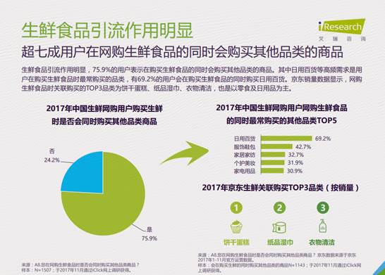 从用户的消费特点来看,报告显示,很多用户会根据需求的即时性选择不同的平台购买生鲜食品,水果是最受网购用户欢迎的生鲜品类。以京东平台为例,2017年1月-11月京东生鲜销量TOP3的品类分别是水果、海鲜水产及冷冻食品。消费频次方面,水果、蔬菜的消费频次相对较高,调研数据显示超过50%的用户每周会网购水果或蔬菜至少一次。同时,超七成用户会在网购生鲜食品的同时购买其他品类的商品,生鲜食品对电商平台的引流作用十分明显。