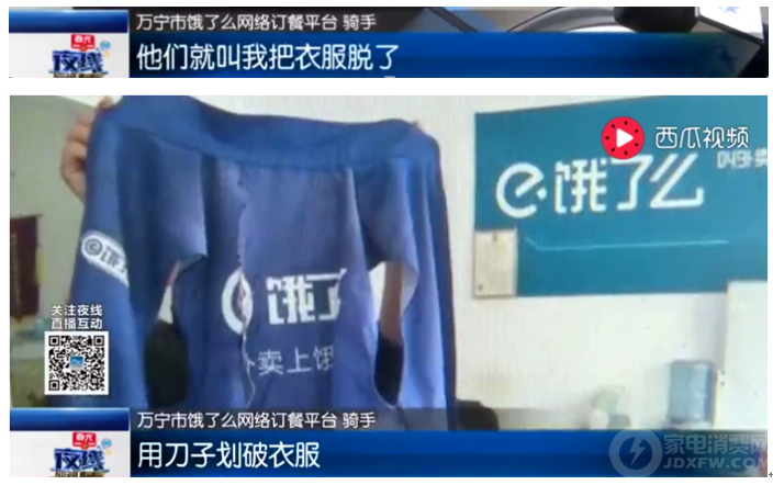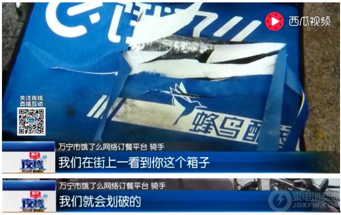 在2017年最后一天,饿了么万宁站多名送餐员被不明身份社会青年拦下来,威胁送餐员不允许在饿了么继续工作,并使用匕首做出损坏外卖保温箱以及划破员工制服等行为。