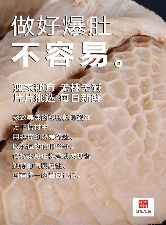 门框韩记麻辣爆肚,中国首家老北京麻辣爆肚创始者,2005年以来不断创新,自主研发,从调味料上来讲,创始人经过十几年来的不断尝试,不断更新,更加符合现代化的口味,麻辣爆肚为什么能征服吃货的味蕾,首先便是麻和辣,单单一味麻,创始人就尝遍了各地的花椒,选择最好的口味,菜的味道越重,对人的味蕾刺激越大,而麻和辣更是最为刺激人的味觉,加上门框韩记麻辣爆肚在十几年之中独创正宗的老北京制作技术,使其味道更加滑而不腻,适合大多数人群的口味,人们只要吃过便想再吃。