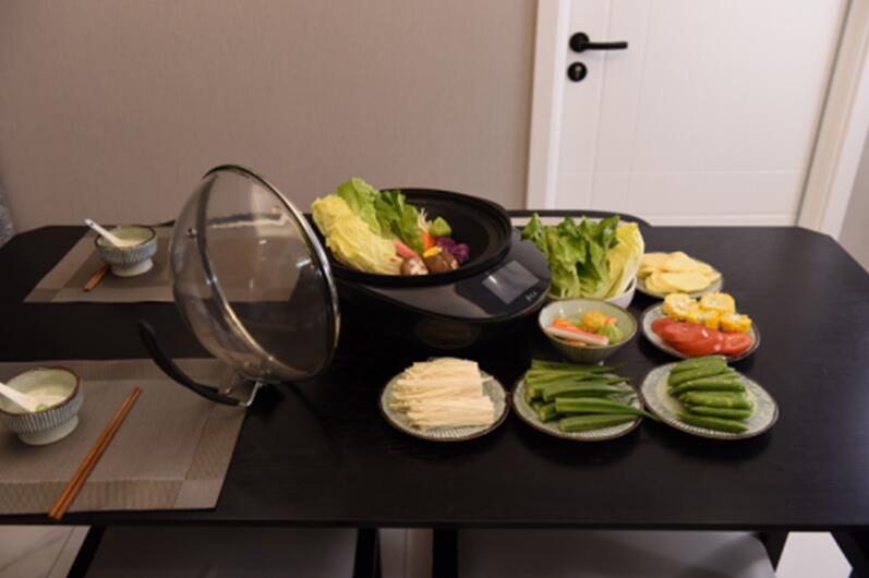 五颜六色的素菜摆放一桌,先把蘑菇、玉米、番茄、金针菇、娃娃菜、素丸子(菠菜丸子、紫薯球、玉米饺子)一同按顺时针围圈排好放入Q锅,加入少量菌菇汤。选火锅模式开启蒸汽素火锅。Q锅快速出蒸汽蒸煮蔬菜,缩短2倍加热时长同时更能保持蔬菜的颜色,水分不流失,还保留了95%的营养。