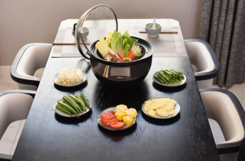 素食火锅的配菜以时令蔬菜为主。花菜,冬笋清口爽脆。生菜蒿菜等绿叶蔬菜,汤汁浓郁。马铃薯片,涮过之后,变得软糯。一家人其乐融融的吃起来!Q锅是用蒸汽蒸火锅,所以在吃的过程中区别于传统火锅,不用加水,自行产生蒸馏水,不会越吃越咸的情况。