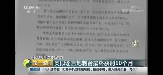 江苏卫视16日的“新闻眼”节目郑重辟谣,有关蒙牛最近发生食品安全问题的消息纯属谣言,谣言炮制者已被判处有期徒刑10个月。