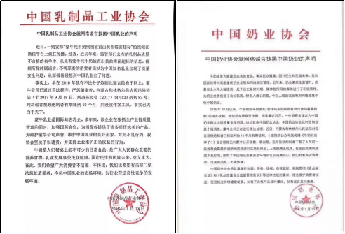 中国乳制品工业协会、中国奶业协会率先为蒙牛发声,严厉指出蒙牛近期发生的食品安全问题纯属谣言,就网络抹黑蒙牛的行为予以痛斥,且敬告大家切莫相信谣言,更不能传播谣言。