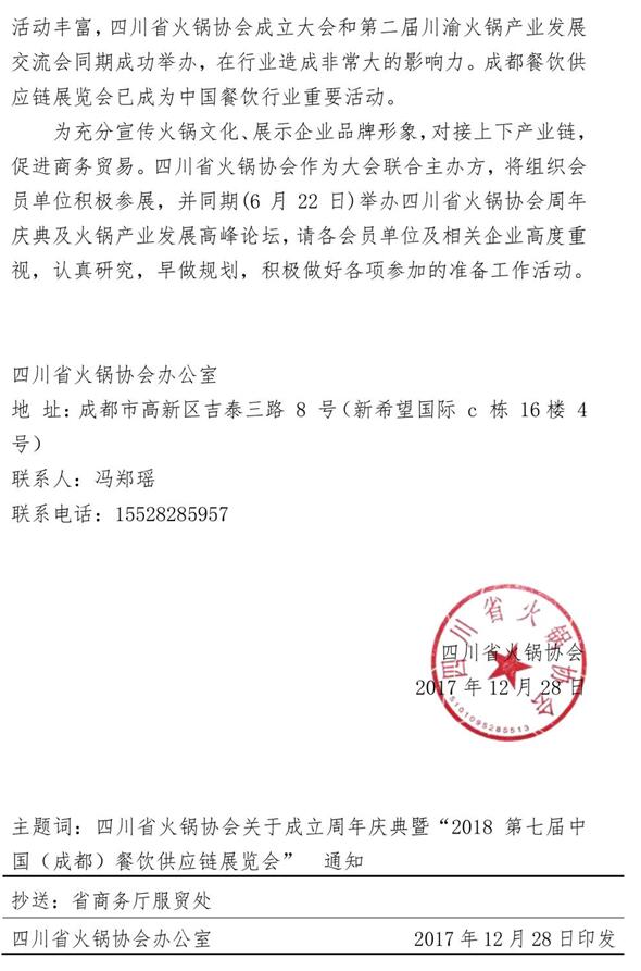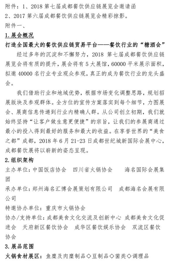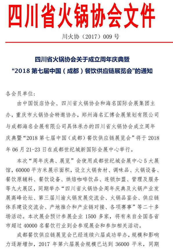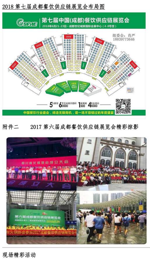 “2018年第七届中国成都餐饮供应链展览会”将于2018年6月21-23日在成都世纪城新国际会展中心举办,由中国饭店协会、四川省火锅协会、海名国际会展集团联合主办,海名会展承办,展览面积60000平方米,设立火锅食材、调味品、火锅设备、餐饮原辅料、餐饮设备、烘焙咖啡饮品、连锁加盟、餐饮管理和服务等九大展区,预计参展企业1500家,将有来自全国20多个省市超过40000名餐饮行业专业观众到会参观!