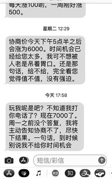 金宾告诉记者,该男子在电话中自称“小王”,是一名“普通消费者”,其声称一开始自己只是想要3000元,但由于拖了几个月,因此要给点“小惩罚”就涨到4000元,还称收了钱就会立即撤诉。让金宾气愤的是,“小王”还撂下狠话:“爽快点我可能还会少一点,不爽快的话我还会加重‘处罚’。”
