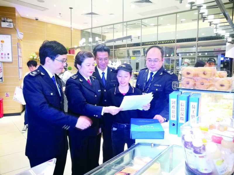 图为深圳市市场和质量监管委巡视员、深圳市食品药品监管局负责人王夏娜(左二)带队在该市龙华区开展“星期三查餐厅”执法活动。