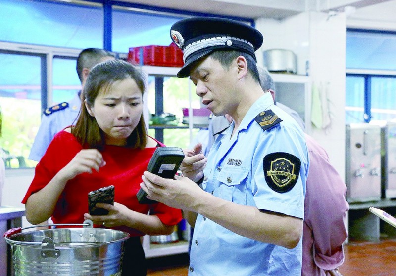 图为福建省福州市仓山区食品药品监管人员对辖区某幼儿园厨房餐具的洁净程度进行检测,并将检测结果告知幼儿园负责人。
