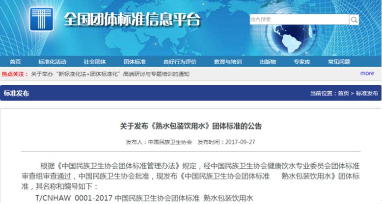 图:熟水包装饮用水团体标准在“全国团体标准信息平台”发布