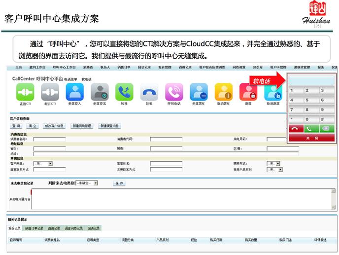 CloudCC无缝集成了辉山乳业的“呼叫中心”,对呼叫中心的CTI服务器地址、设备注册地址、外呼号码等进行配置,以及坐席的唯一标识、工号、绑定的设备类型,并让辉山乳业通过熟悉的、基于浏览器的界面去访问;CloudCC还提供了会员邀约工作台功能,通过多维度条件查找系统内会员客户进行活动邀约,以短信或邮件方式将活动信息通知会员。还支持多元化的会员情况统计分析。
