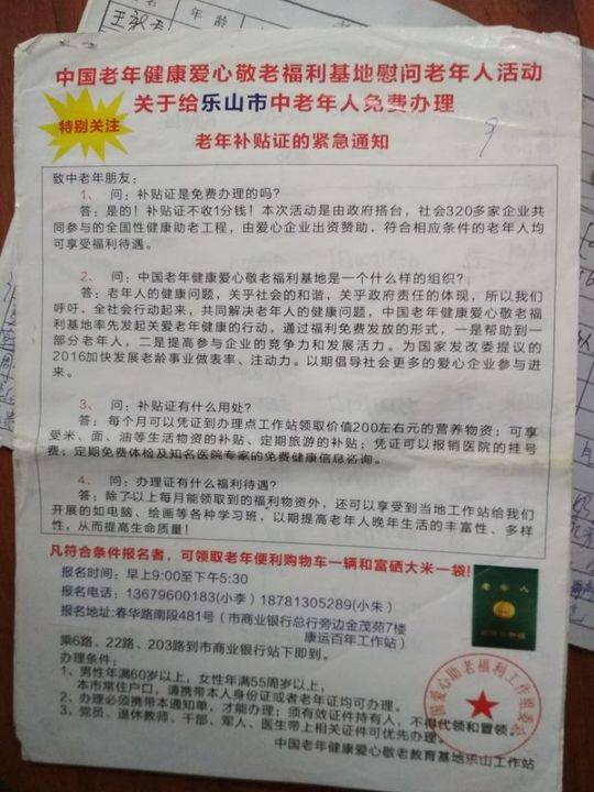 桌子上,还有几本《老年人高级补助证》。这所谓的补助证,只要老人携带本人身份证或老年证方可办理,办理后,还可获得“198元的品牌手包一个以及老年便利购物车一辆”.然而,当老人办了证后,便会接到公司打来的电话,邀请其参加健康宣传讲座。