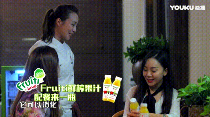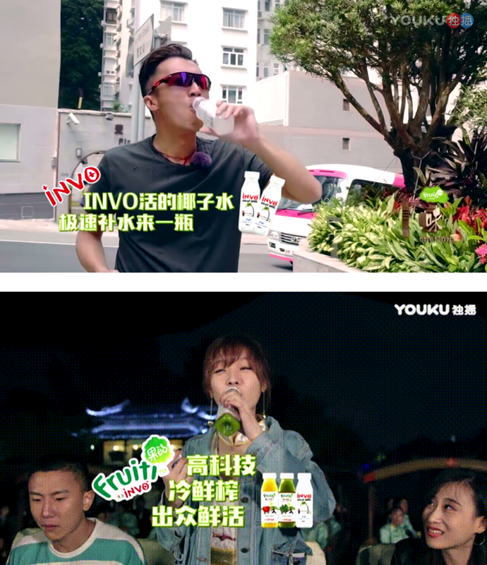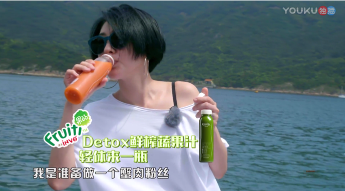 还有更多Fruiti果的果汁产品以花样植入的方式出现在节目内容中,例如明星嘉宾运动喝果汁、配餐时来一瓶Fruiti鲜榨果汁等。将INVO椰子水、Fruiti富士苹果汁、羽衣甘蓝混合蔬果汁三款主推产品打造成网红果汁。