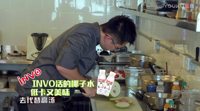 锋厨们低卡大餐PK赛,Joanna用INVO椰子水代替高汤,非常低卡,让美食营养美味又健康,巧妙的融合节目,很好的展现了Fruiti“低卡营养丰富”的特点。