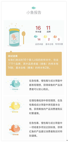 您听说过用鱼胚胎来测试消费品安全的吗?香港第三方检测机构水中银近日采用新兴的鱼胚胎生物测试技术“小鱼亲测”,对目前在港销售的16款婴幼儿奶粉的安全属性进行全方位考核。其中14款奶粉代表“品质卓越”的“绿鱼”,两款奶粉代表“基本合格”的“黄鱼”。此前进入香港市场的君乐宝奶粉,作为唯一的国产奶粉品牌,在众多洋品牌中表现优秀,获得了“绿鱼”最高评级。