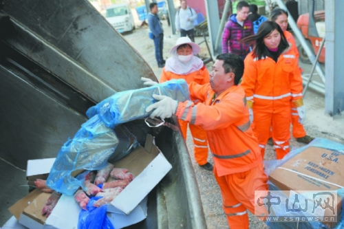 2月5日,中山市食品药品监督管理局对一批问题冷冻肉进行销毁。