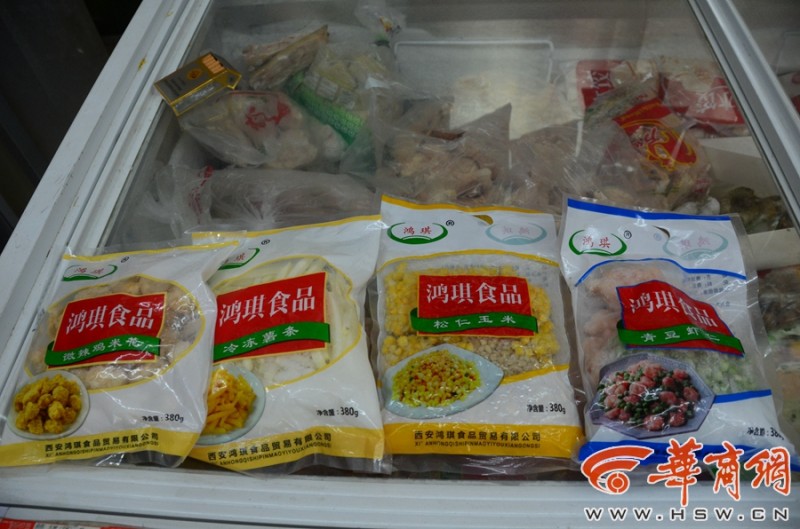2月5日上午,华商报记者在榆林市恒安路王先生的果蔬店看到,鸿琪甜玉米粒、鸿琪薯条、鸿琪青豆虾仁、鸿琪微辣鸡米花4种食物,每一袋的包装都清楚地印着生产日期,但仔细看,可以看到在旁边有一个钢印的时间,均在2016年,而新的喷墨时间均在2017年7月至10月之间,两者相差1年之久。该食品的保质期为12个月,也就是说该食品在过期之后被重新喷墨以新品卖出。