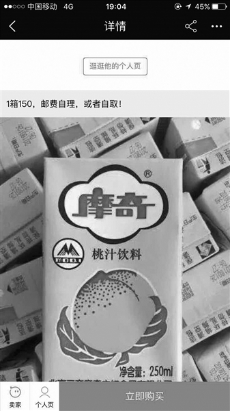 另一名黄牛则表示,自己店里的摩奇桃汁5元一盒,北京五环内可以用闪送的形式送货。这位卖家称“没有起拍数量,但是买少了闪送不划算”。 当北青报记者询问店内摩奇桃汁的来源以及是否保真时,店家没有再回复。