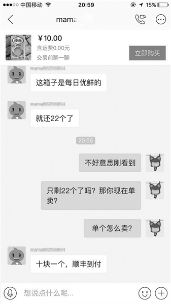 而这22盒摩奇桃汁,10元一盒出售,邮费需由买家自付,“直接每日优鲜的箱子寄出,下周一还会到货”。