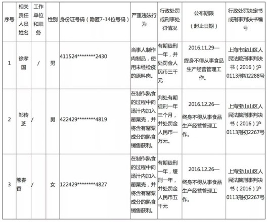 上海市食药监局2月8日发布,根据相关法律法规,决定将徐孝国、邹传芝、熊春香3人列入上海市食品药品严重违法生产经营者与相关责任人员重点监管名单。相关当事人使用未经检疫的原料肉制作肉制品,或在制作熟食的过程中向汤汁内加入罂粟壳并销售获利,受到刑事处罚。详见↓
