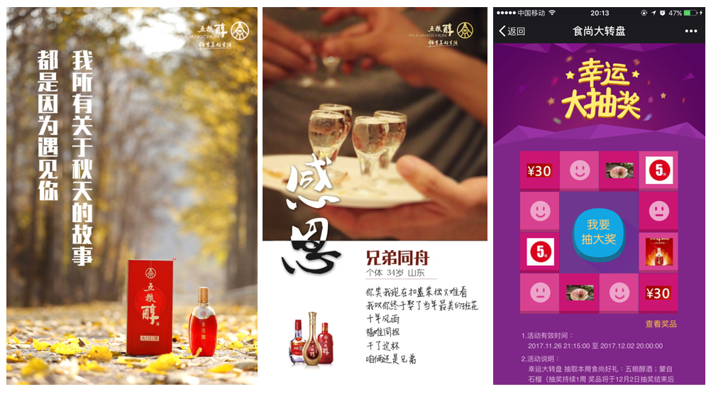 以生活态度为主题的《不是所有时候都该负重前行》《云和积雪苍山晚,新炉煮酒共尽欢》《好选择成就美好生活》;以传统时令节气风俗为主题的《小雪晴时不共寒,胸次无忧酒量宽》《喝了冬至酒,一天长一手》等传播内容,以新奇有趣的形式占领大量受众注意力,加深节目与品牌的融合度和亲和力。同时借势举办各类抽奖活动,如国庆期间海报大赛、春节期间新年愿望清单、2018臻选美好生活等,增加品牌的曝光量和粘合度,用各种大奖真诚回馈消费者。