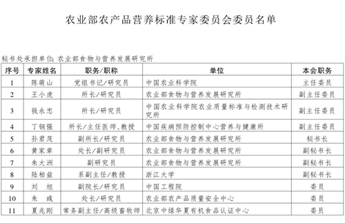 专家委员会,主要负责农产品营养标准的研究、拟定、审定、宣贯、咨询、国际合作交流等工作,陈萌山任主任委员。