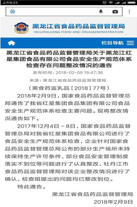 附件:《黑龙江省食品药品监督管理局关于黑龙江红星集团食品有限公司食品安全生产规范体系检查存在问题整改情况通报》